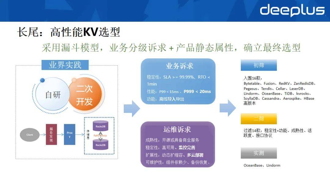 针对长尾问题,货拉拉实施了多项优化措施,包括对Compaction的优化、GC调优、内存优化及不同业务场景的专项治理。然而,由于HBase的架构特性,其无法彻底解决该问题。因此,引入了高性能KV选型方案以应对该挑战。