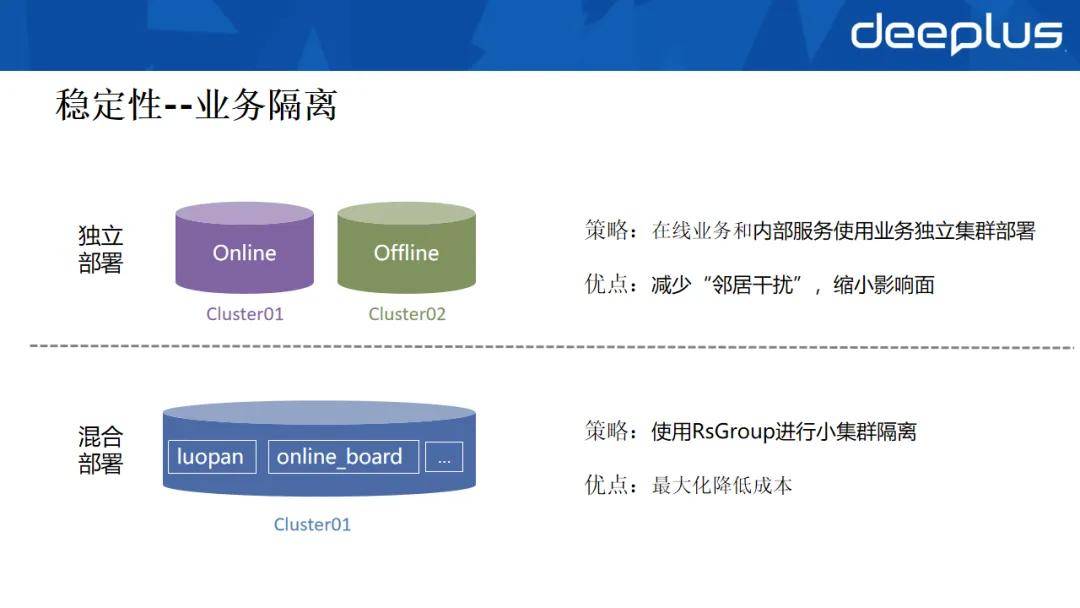 将在线业务与离线业务拆分,离线业务独立部署。由于离线业务可能存在大规模或不定期读写操作,对底层磁盘压力比较大,同时数据量也庞大,因此无法与在线业务进行共同部署。该策略的优点是不影响在线业务的稳定性与性能。