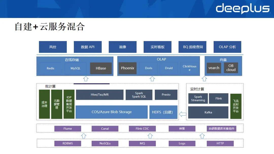 大数据存储架构采用自建+云服务混合部署的方式,根据数据流向分布,展现出典型的Lambda架构特征。源头数据在经过底层的采集、处理和加工后,会分成实时和离线两条路线。离线数据会落入离线存储中,而部分AI数据则会流入向量存储。实时数据与处理后的离线数据汇合后,会流入在线存储,共同为上层应用层提供服务。