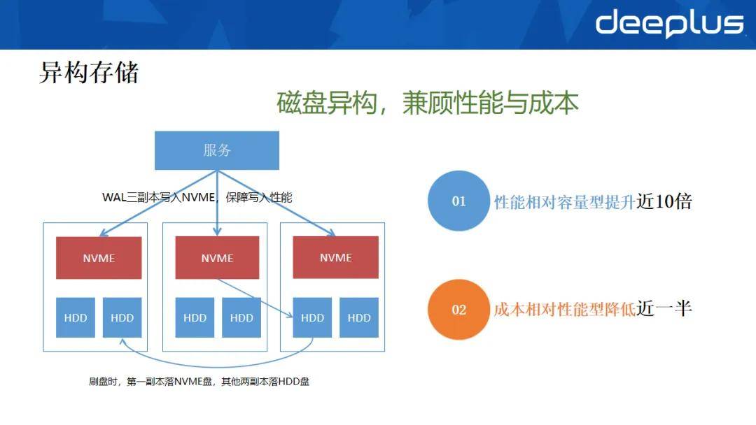 具体而言,利用HDFS的磁盘异构能力,在每台机器上引入NVMe盘并搭配大容量HDD硬盘。数据写入时,确保WAL的三个副本都写入NVMe盘以保障写入性能。