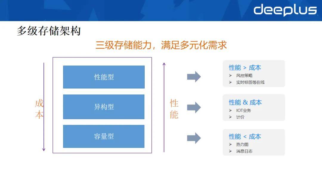 按当前规划及建设,在线存储架构可按成本和性能划分为性能型、异构型、容量型三层,从上到下成本递减,从下到上性能递增。