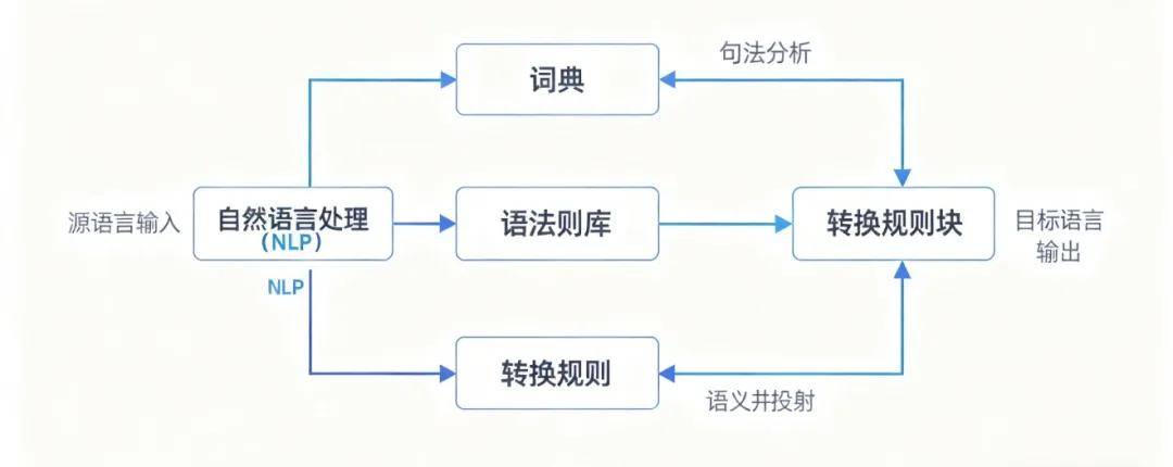 大家可以发现,在早期机器翻译中,有词典、语法规则库、转换规则等等约定好的规则库,而这些规则库决定了翻译功能的具体实现。