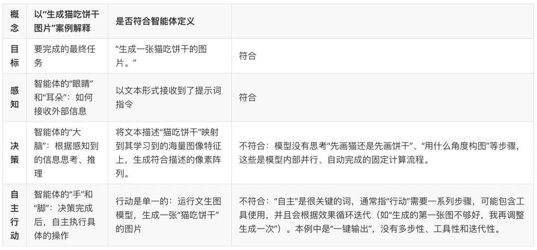我们发现“智能体”的几个关键因素是:**"感知"、“决策”、“目标”、“自主行动”**,而大家可以思考一下,之前我们用ChatGPT输入一个提示词来生成了一张图,那么这阶段的ChatGPT是智能体吗?我们可以来简单分析一下: